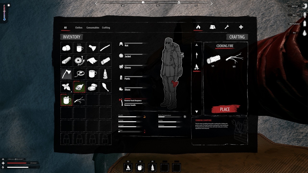 В начале игры мы теряем наш рюкзак и почти все припасы, включая снаряжение. В дополнение к холоду, плохой видимости и нехватке еды, нас начинает преследовать голодный медведь, от которого нам приходится убегать, прятаться и ставить против него ловушки. Ловушки также можно использовать для охоты на дичь. Чтобы сэкономить, вам нужно следить за показателями пищи, воды, холодоустойчивости и психического здоровья. Потеря рассудка приводит к переутомлению, ослаблению воли и галлюцинациям. Вы можете получить травмы, которые повлияют на вашу игру и ваши движения. Существует система динамического изменения погоды, поэтому вам приходится приспосабливаться к условиям. Вы можете исследовать полезные места. Охотничий домик можно отремонтировать и превратить в настоящее святилище.
