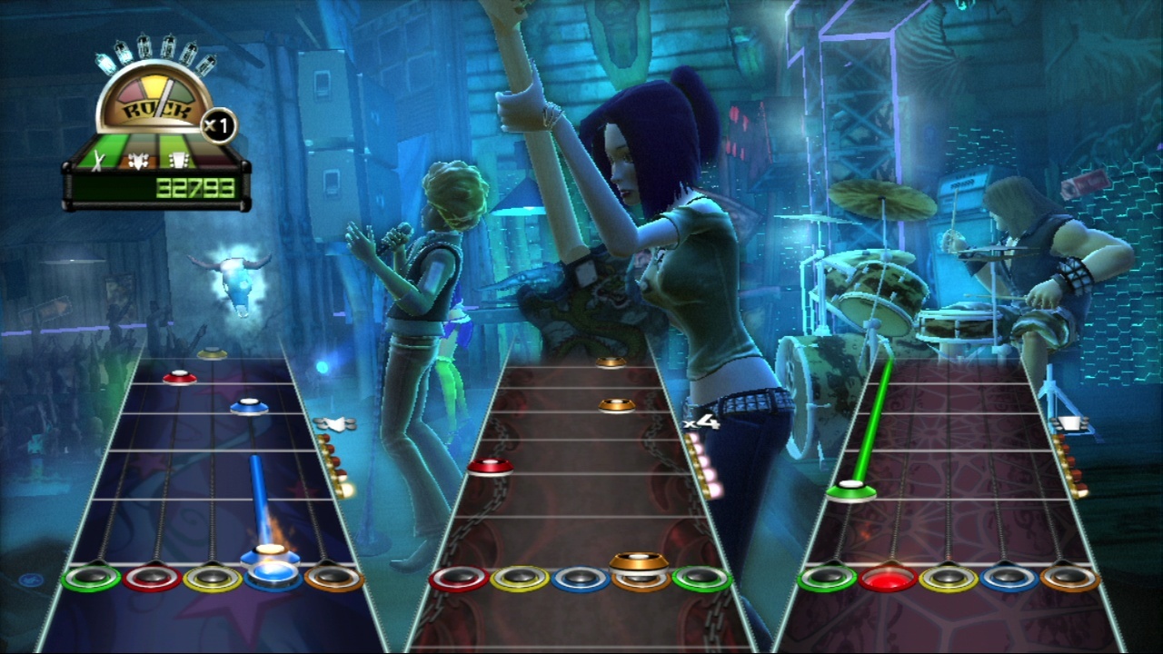• Визуализация. Игрушка получила неплохую графику, но ничего сверх необычного. Как и раньше, большую часть игрового пространства занимает схематические «дорожки» с нотами, которые движутся неистово быстро. И теперь на фоне разворачиваются «динамические картины»: концерт известных рок-групп, с прорисовкой каждой из них в «мультипликационном стиле».• Игровой процесс. Кардинальным образом музыкальный симулятор также не меняется. Как и раньше, главная задача – попадать в ноты своевременным нажатием клавиш, и стараться как можно меньше пропускать их, чтобы набить максимально возможное «комбо».