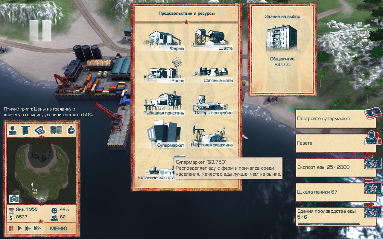 Помимо этого нужно заявлять о себе, обустраивая свой новый дворец и устанавливая золотые статуи по всей стране, пока бедные крестьяне собирают куски хлеба. Нам предлагают попробовать поиграть в 50е годы, во время холодной войны за одного диктатора из Южной Америки.